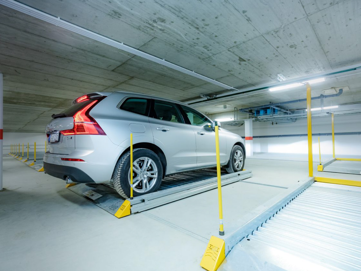 O seu veículo é estacionado em várias filas de estacionamento subterrâneo e é a plataforma individual que se move.  A área de condução é reduzida, sendo substituída por área de estacionamento.