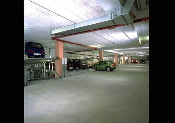 O sistema é ideal para zonas muito condicionadas à nível de altura. Ambas as plataformas são de acesso inclinado. A inclinação da plataforma é de 5° | 9%, para que veículos com suspensão rebaixada de série, possam estacionar na plataforma sem bater.