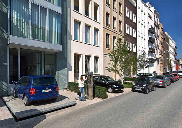 O Parklift 461 é instalado no solo de forma invisível, a plataforma subterrânea horizontal só fica visível quando elevada durante os procedimentos de entrada ou saída do estacionamento. A placa de cobertura pode ser revestida individualmente de acordo com o desejo do cliente, adequando-se assim ao ambiente.
