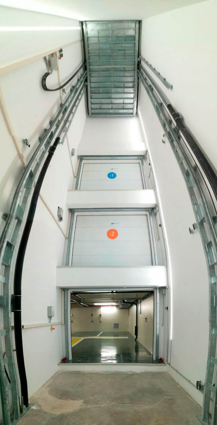 A acessibilidade automóvel aos 3 pisos abaixo do solo é realizada verticalmente com o apoio fundamental da nossa plataforma auto Idealpark para viaturas até 3.200kg com certificado para transporte de condutor a bordo. A flexibilidade e desenvolvimento de largas décadas do nosso fabricante Idealpark, permitiu garantir uma solução fiável e esteticamente diferenciadora. Veja mais nas imagens.